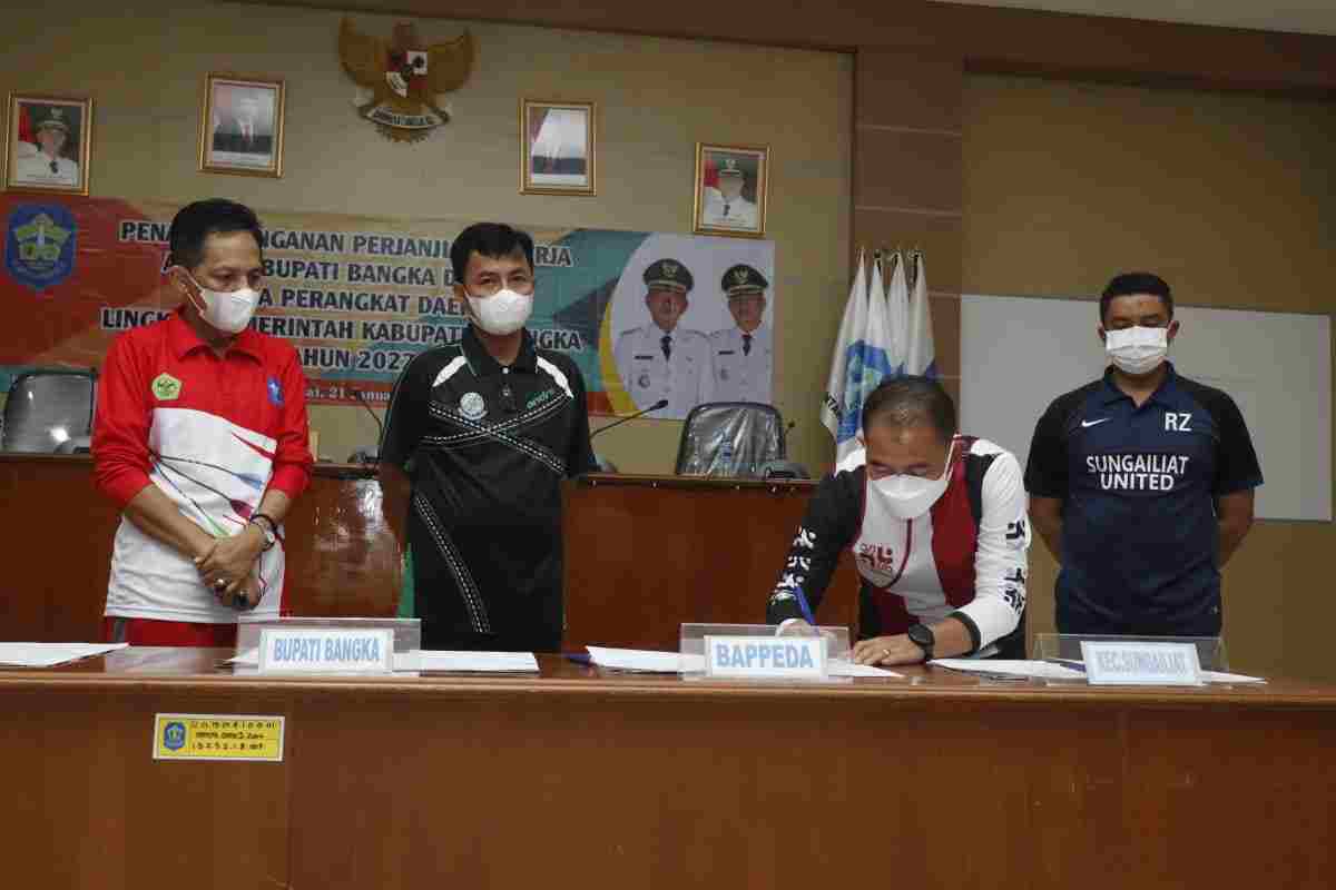 SUNGAILIAT – Seluruh pimpinan Organisasi Perangkat Daerah (OPD) Pemerintah Kabupaten Bangka menandatangani perjanjian kinerja di depan Bupati Bangka, Jumat (21/1/2022).