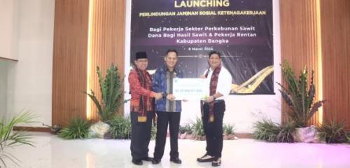 Sungailiat - Pemerintah Kabupaten (Pemkab) Bangka melakukan launching jaminan sosial ketenagakerjaan (jamsostek) bagi pekerja sektor perkebunan sawit, dana bagi hasil sawit dan pekerjaan rentan di Kab. Bangka, Jum'at sore (08/03/24) di Gd. Graha Maras.