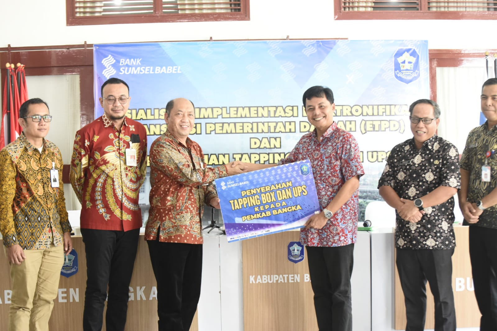Kamis (25 Agustus 2022) Kepala BAPPEDA Kabupaten Bangka, Pan Budi Marwoto menerima tapping box dan UPS secara simbolis dari Direktur Kepatuhan Bank Sumsel Babel, Mustaqiem dalam acara sosialisasi implementasi Elektronifikasi Transaksi Pemerintah Daerah (ETPD) di rumah dinas Bupati Bangka. Pelaksanaan acara ini sekaligus dalam rangka optimasi kerja sama antara Bank Sumsel Babel dengan Pemkab Bangka.
