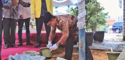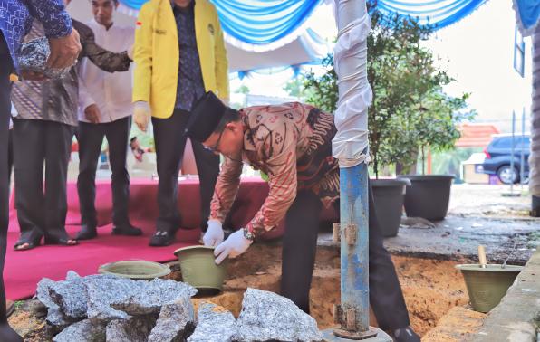 Sungailiat- Wakil Bupati Bangka Syahbudin S.IP M.Tr.Ip didampingi Sekda Bangka H.Andi Hudirman dan Ketua Tim Penggerak PKK Kabupaten Bangka, Yusmiati Mulkan, melakukan Peletakan Batu Pertama Pembangunan Masjid Baitul Afkar Stisipol Pahlawan 12 Sungailiat, Jum'at (14/04/2023).