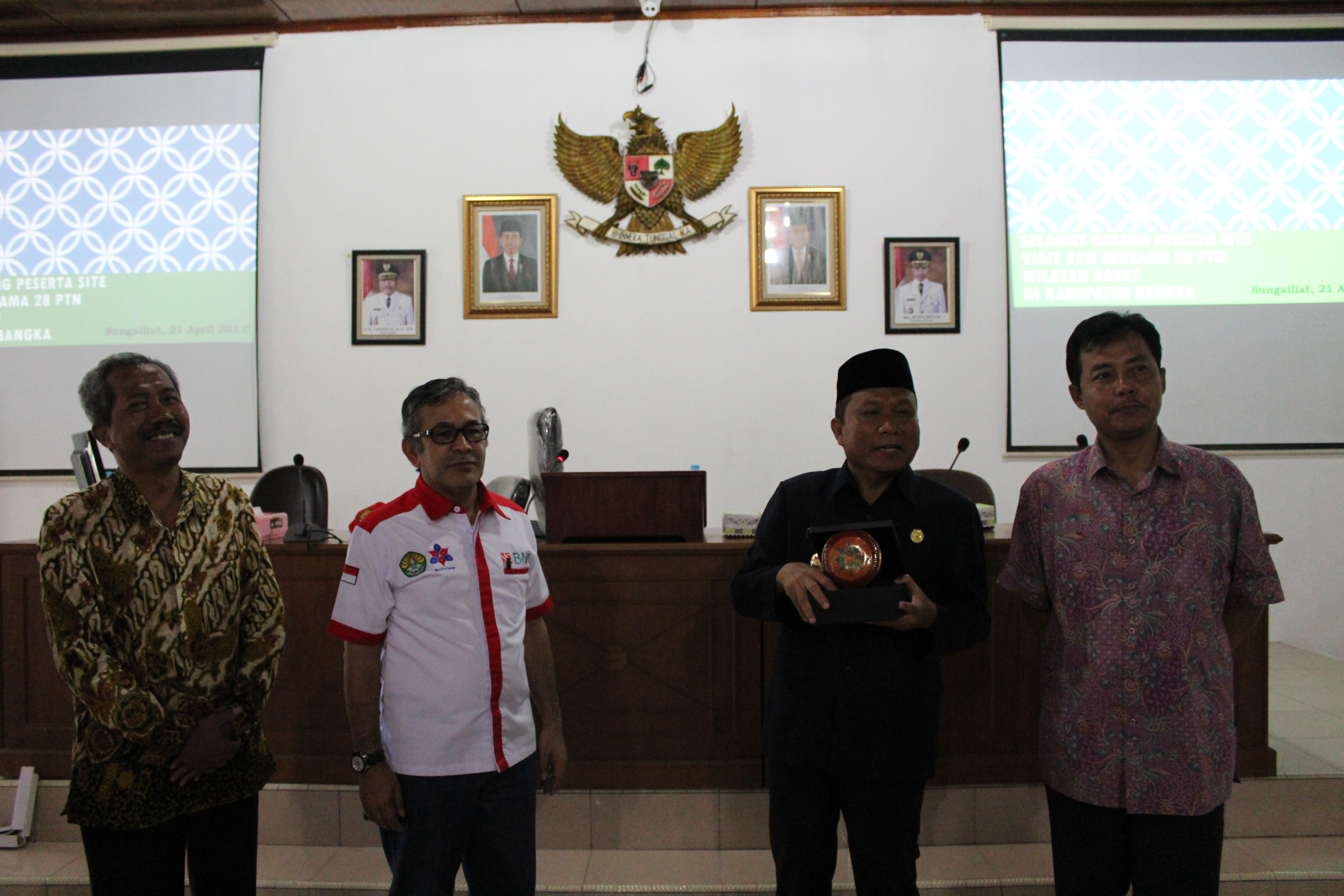 Kesempatan itu Bupati Bangka Tarmizi Saat memberikan cinderamata kepada perwakilan PTN, diantaranya yang hadir rektor Universitas Tengku Umar, Prof Jasman J.Ma’ruf. (Humas)