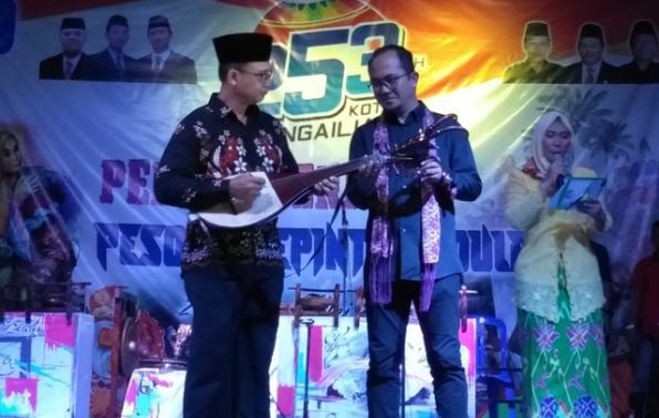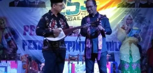 Sungailat-Wakil Bupati (Wabup) Bangka Syahbudin membuka pentas seni dan bazar produk usaha mikro kecil dan menegah (UMKM) Kecamatan se-Kabupaten Bangka dalam rangka peringatan HUT Kota Sungailiat yang ke-253 ditandai dengan memetik gitar dambus secara simbolis, jum’at malam (26/4/2019) di Taman Kota Sungailiat.