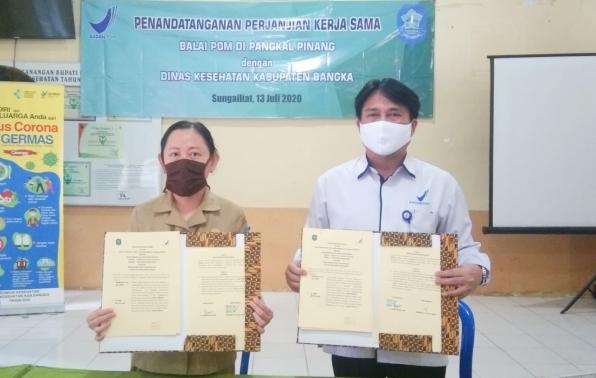 Sungailiat, Guna memberikan perlindungan kepada masyarakat dari obat- obatan dan makanan yang berisiko terhadap kesehatan, Balai Pengawasan Obat dan Makanan (BPOM) bersama Dinas Kesehatan Kabupaten Bangka melakukan perjanjian kerjasama untuk melakukan pengawasan obat dan makanan yang beredar di masyarakat, Senin (13/7/2020).