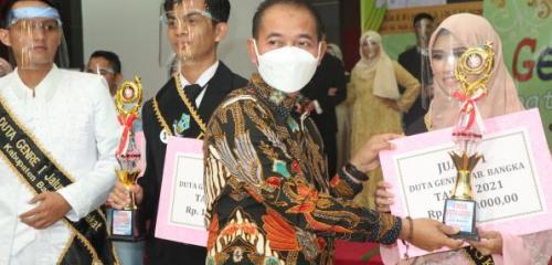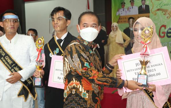 Sungailiat - Pasangan Rokip dan Fadillah Rizqi berhasil menyandang Duta Gendra Kabupaten Bangka tahun 2021. Prosesi penyematan selempang berikut penghargaan lainnya langsung diberikan oleh Bupati Bangka yang didampingi Ketua TP PKK Kabupaten Bangka dan Sekretaris Daerah (Sekda) Bangka.