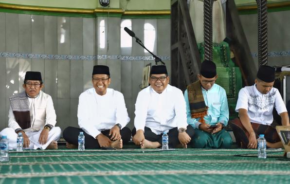 Mendo Barat - Pj Bupati Bangka M. Haris AR, AP, M.H bersama Pj Gubernur Provinsi Kepulauan Bangka Belitung Sugito, S.Sos, M.H serta jajaran OPD Pemkab Bangka mengikuti rangkaian peringatan Maulid Nabi Muhammad SAW 1446 H yang digelar masyarakat Desa Kemuja, di Masjid Rahmatuddin, Senin (16/09/2024) Pagi.